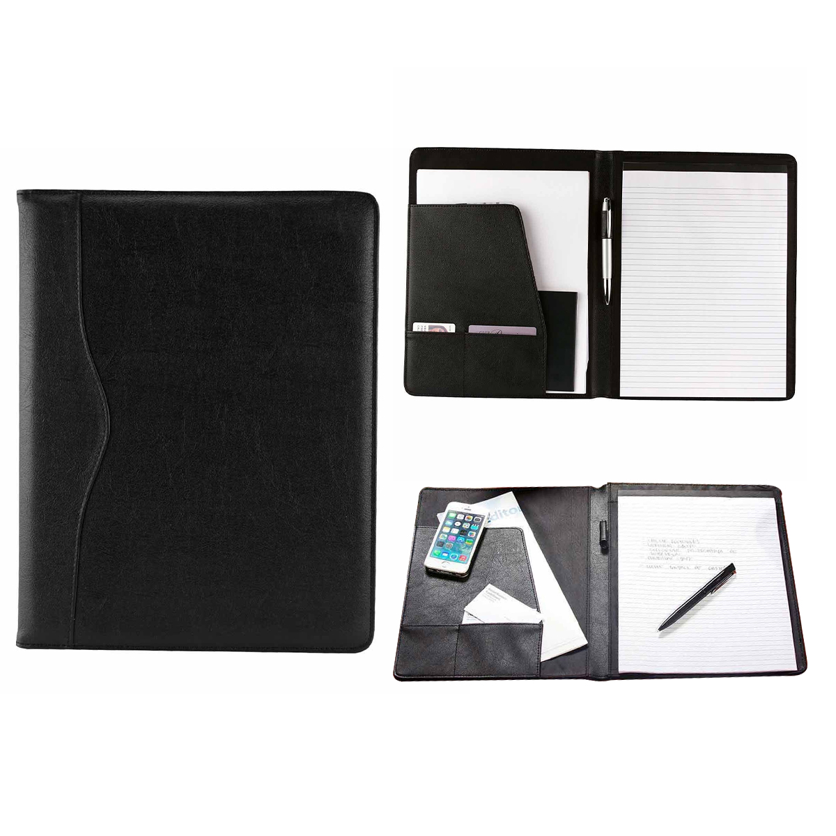 Incluye block de raya tamaño A4 con 20 hojas, compartimento para bolígrafo, documentos y tarjetas. No incluye bolígrafo.
