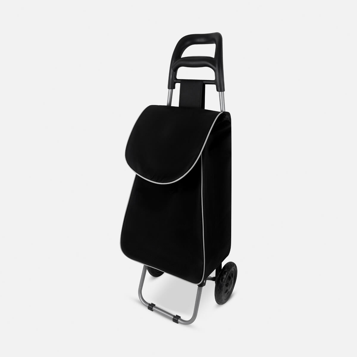 Bolsa para supermercado con jareta y solapa. Incluye bolsa posterior con cierre, estructura de metal, base para sostenerse, agarradera y llantas de plástico. Bolsa desmontable con velcro en la parte posterior. Ideal para las compras de fin de semana.