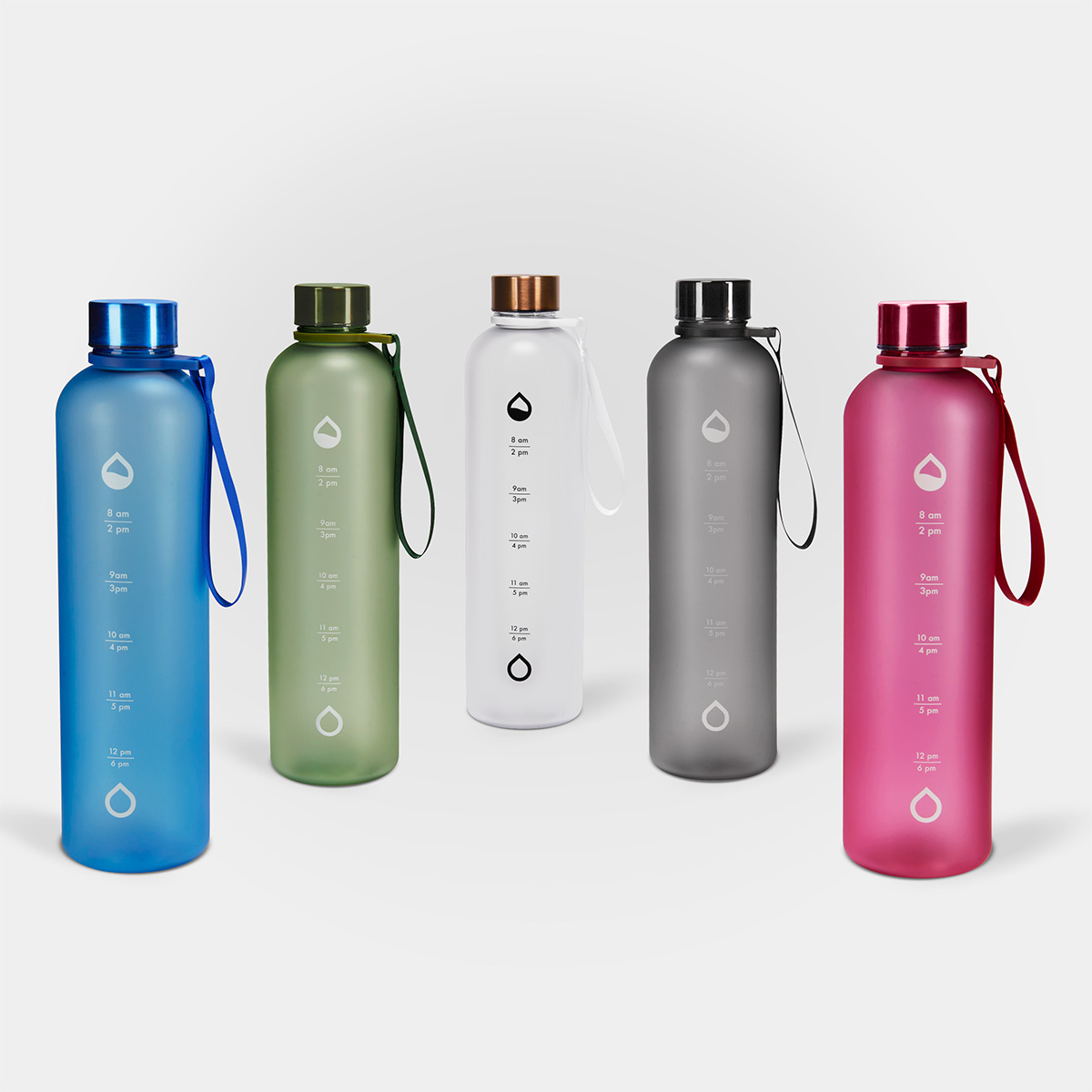 Tapa metálica con cierre de rosca. Aro de plástico con asa de tela. Cuerpo con terminado mate, suave al tacto y color frosty . Incluye marcador de tiempo para motivar tus hábitos de hidratación. Incluye caja individual.