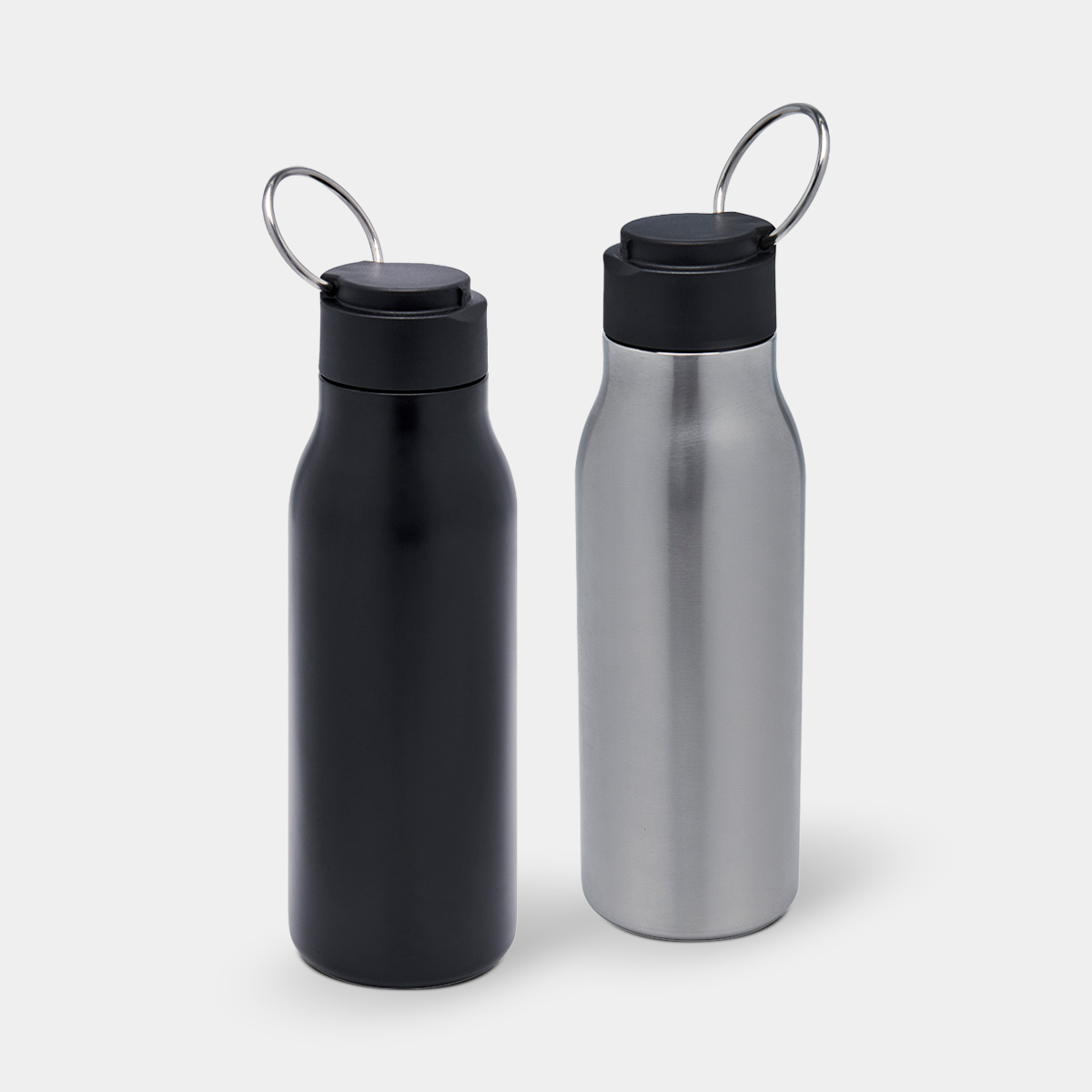 Cilindro metálico de una pared y tapa de plástico con cierre de rosca. Incluye aro metálico en la tapa que funciona como asa. Terminado mate. Incluye caja individual.