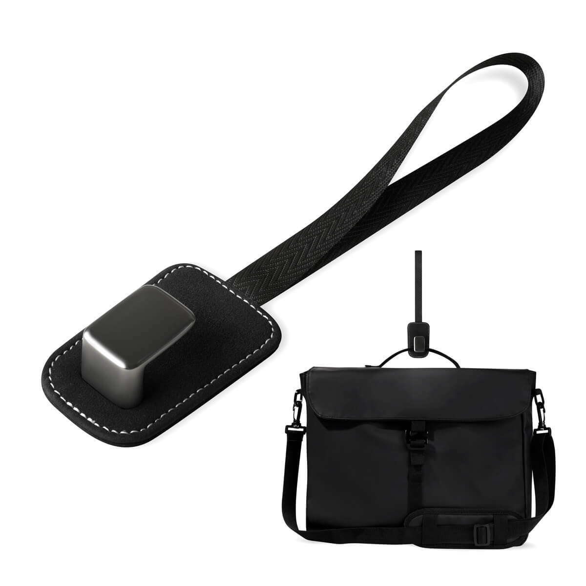 Gancho de metal perfecto para colgar bolsas, mochilas o accesorios. Su asa de poliéster permite montarlo y desmontarlo fácilmente, adaptándose al respaldo de cualquier asiento de coche. Incluye caja individual.
