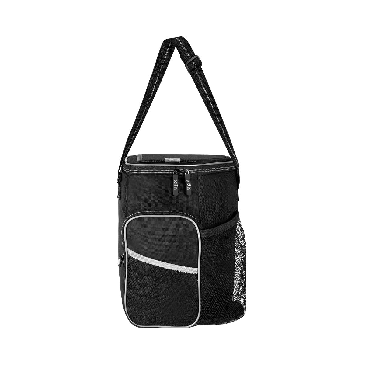 Interior plastificado impermeable. Bolsa frontal con cierre y bolsillo lateral y frontal de malla. Bolsa principal con cierre y ventana superior para fácil acceso al interior. Incluye correa ajustable. Capacidad para 6 latas.