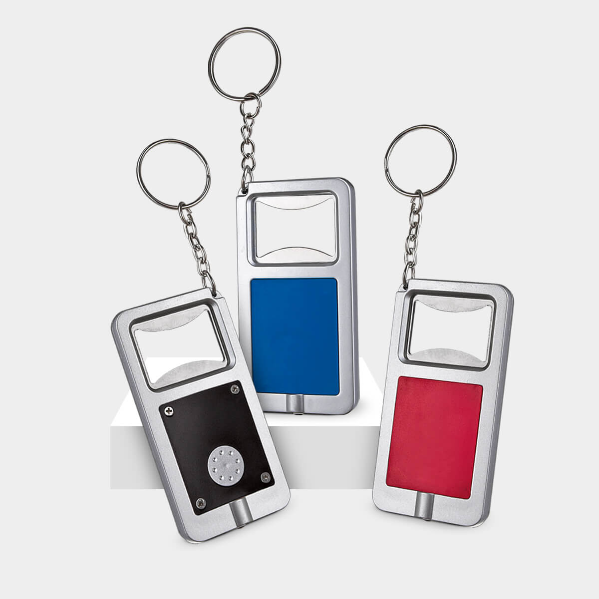 Llavero destapador con lámpara de 1 LED. Incluye 2 baterías de botón.