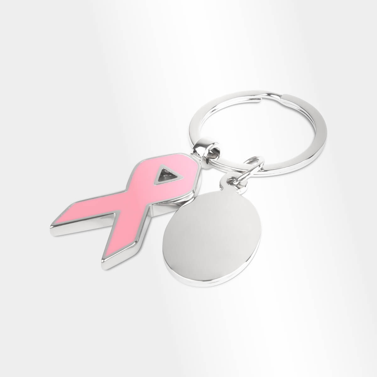 Llavero metálico con diseño en forma de listón rosa y placa redonda para grabado. Símbolo de apoyo y concientización del cáncer de mama. Personalízalo con una fecha especial, un nombre o el mensaje que desees. Además de mantener tus llaves organizadas, es un accesorio elegante, significativo y funcional.