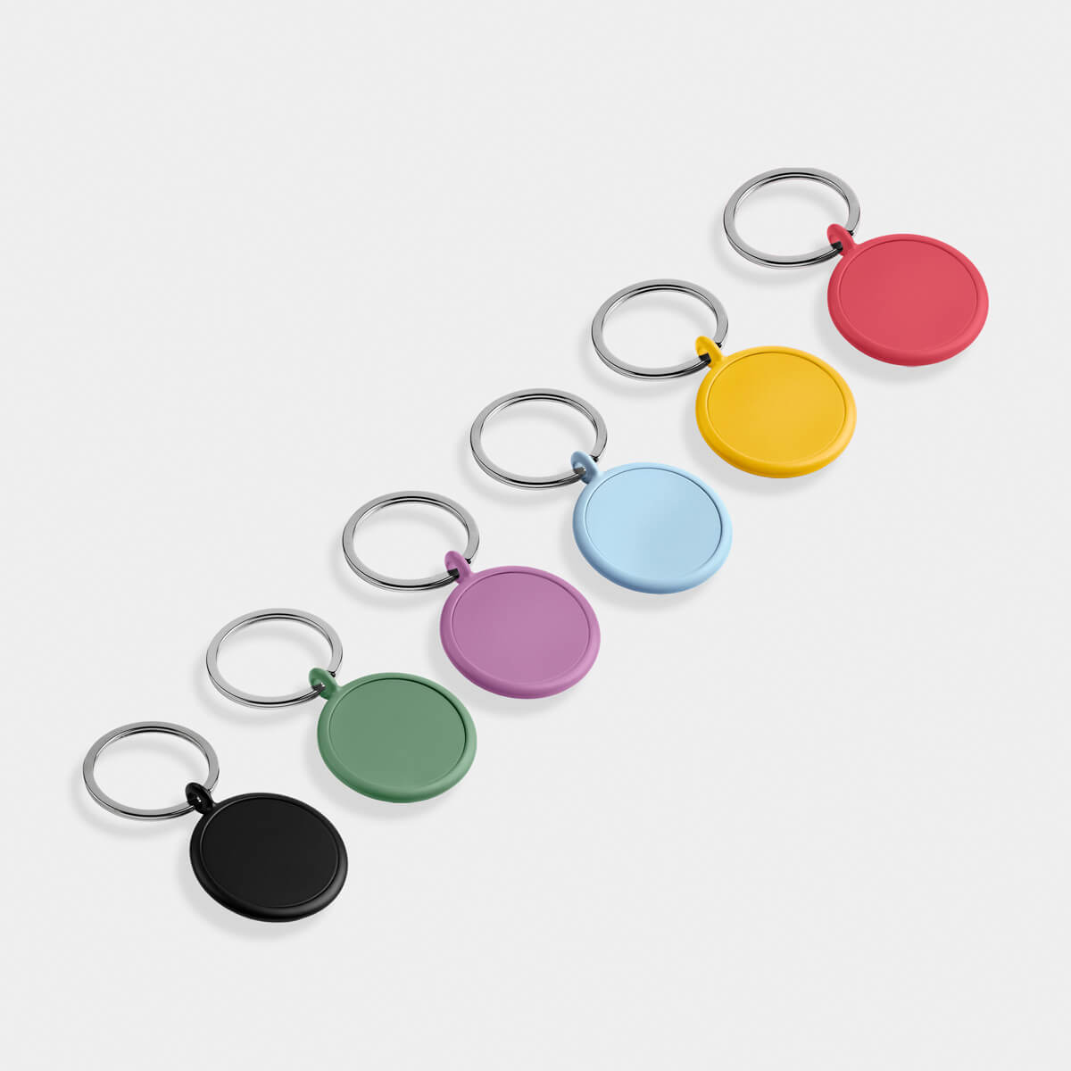 Llavero metálico circular con terminado mate.