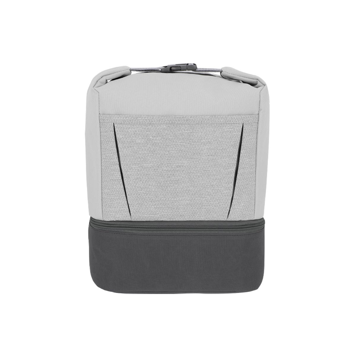 Interior plastificado. Doble compartimento con cierre. Bolsillo frontal. Agarradera con broche de plástico. Capacidad para 9 latas.
