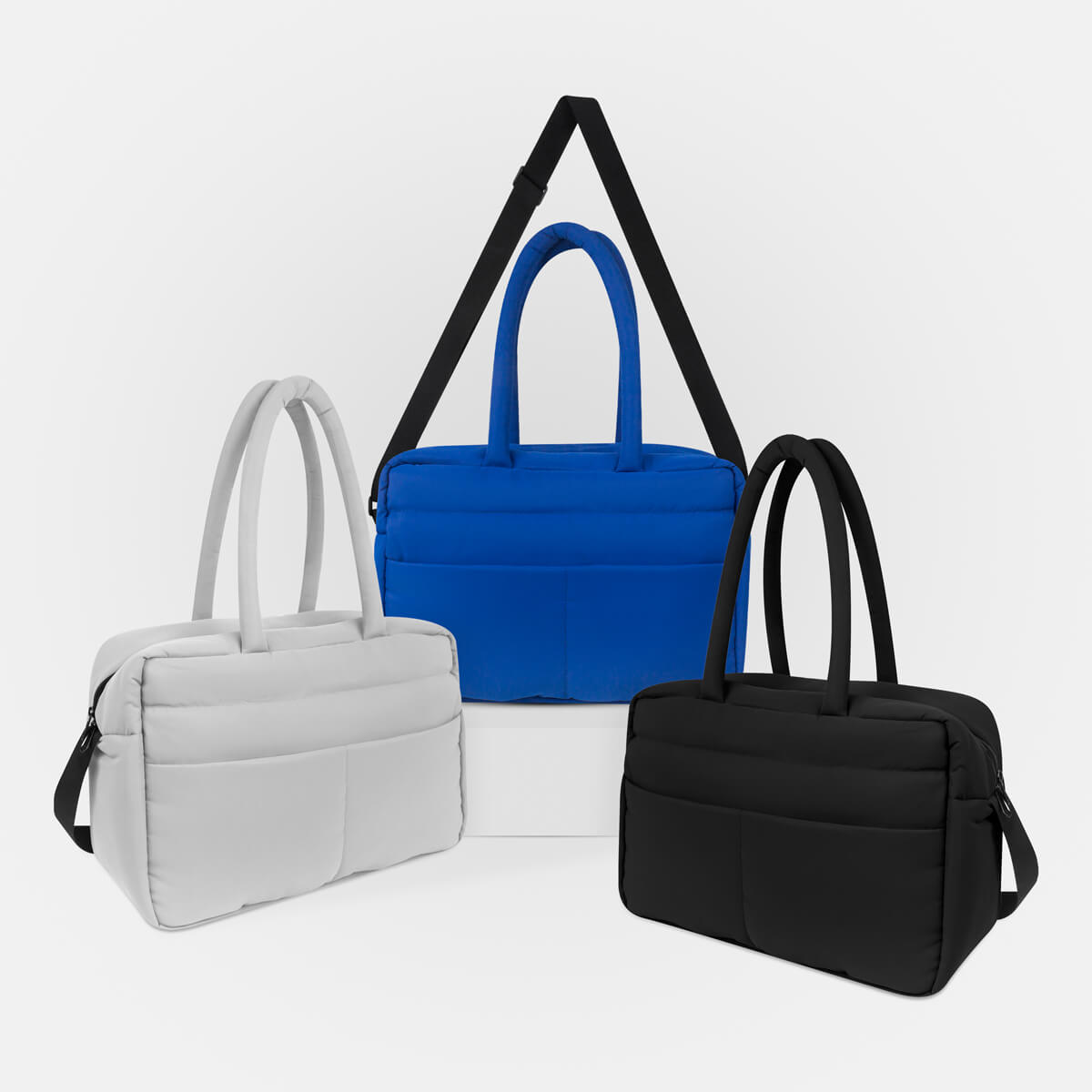 Maleta con exterior acolchado, suave al tacto, ideal para llevar tus pertenencias con comodidad. Cuenta con asas de mano del mismo material, asa de poliéster ajustable para hombro y banda para colocar en trolley. Incluye un bolsillo frontal con cierre, compartimento principal amplio con cierre y organizadores internos para mantener el contenido en completo orden.