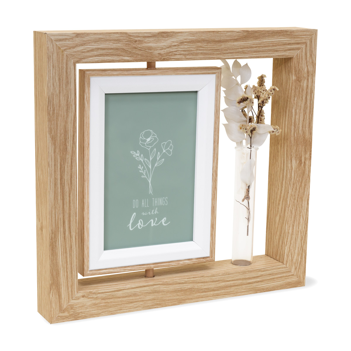 Su diseño elegante y atemporal, resaltará la belleza de tus fotos favoritas. Contiene un marco giratorio, con capacidad para fotografías de 10 x 15 cm y un recipiente de vidrio con flores secas. Añade un toque cálido y natural a tus espacios. Incluye caja individual.