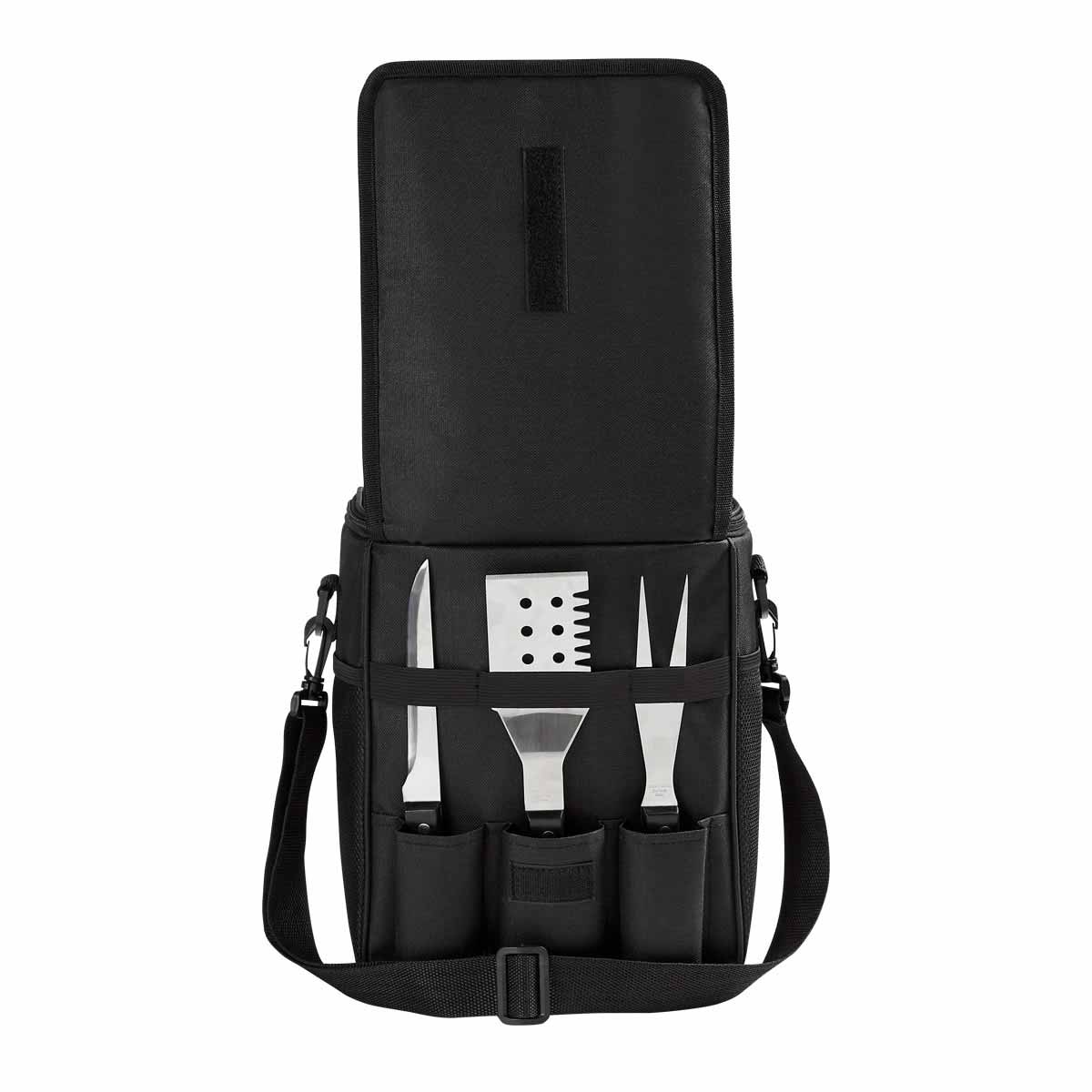 Bolsa principal con función de hielera. Capacidad para 12 latas. Incluye bolsa frontal con 3 compartimentos internos para el set de cuchillo, espátula y tenedor. 2 Bolsas laterales de red y correa ajustable.