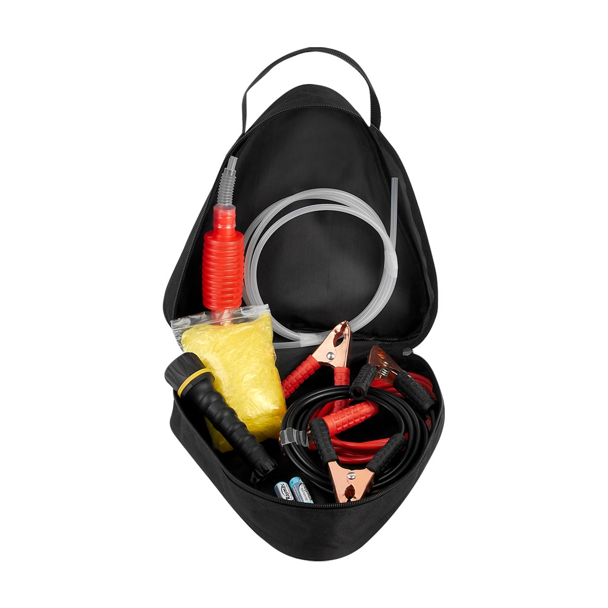 Contiene cables pasa corriente, bomba manual para gasolina, linterna con 2 baterías AA (incluidas), poncho de plástico y funda con triángulo reflejante.