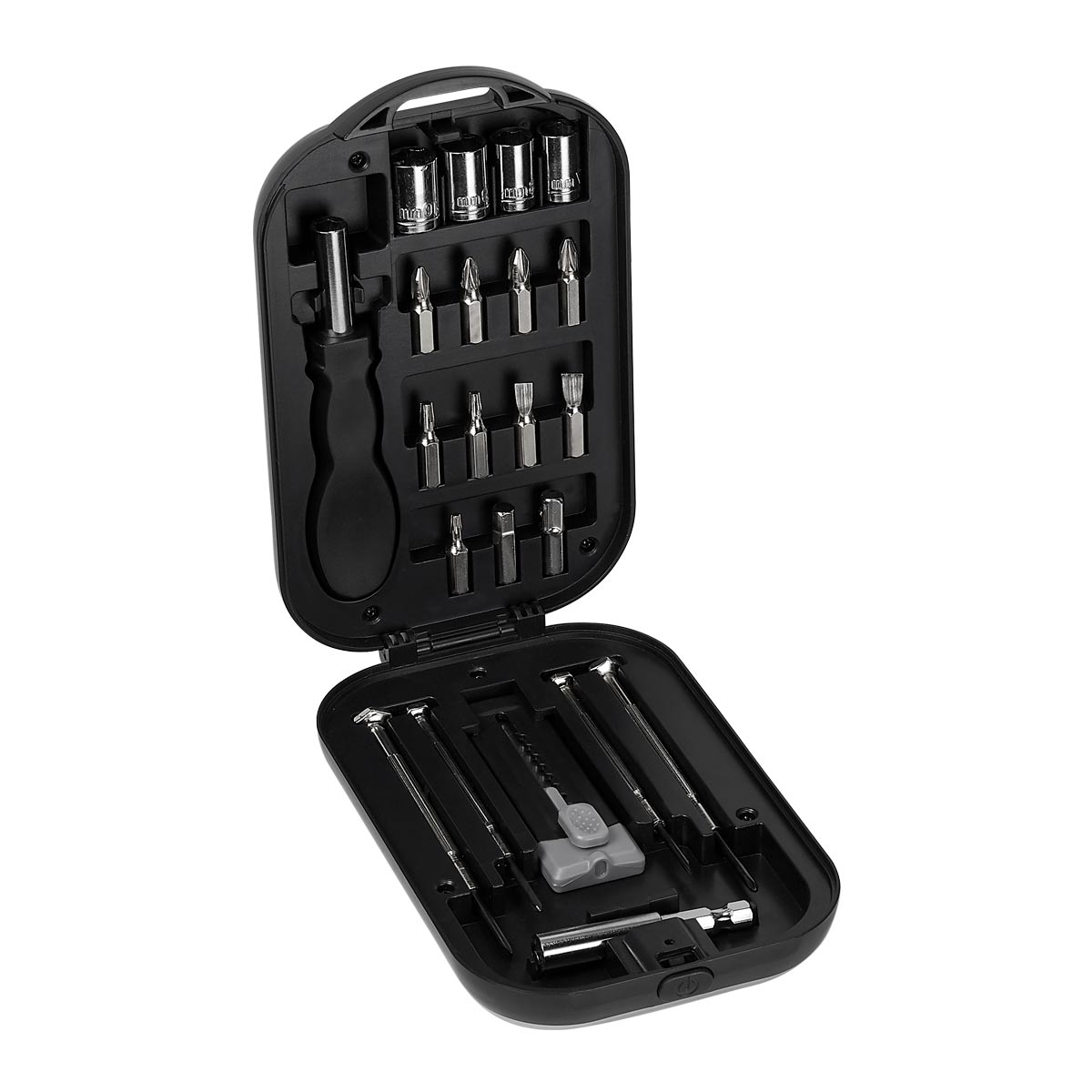 Contiene cúter, 4 desarmadores de relojero, dado extensión, 4 dados, desarmador con 10 puntas diferentes e intercambiables. Incluye estuche.