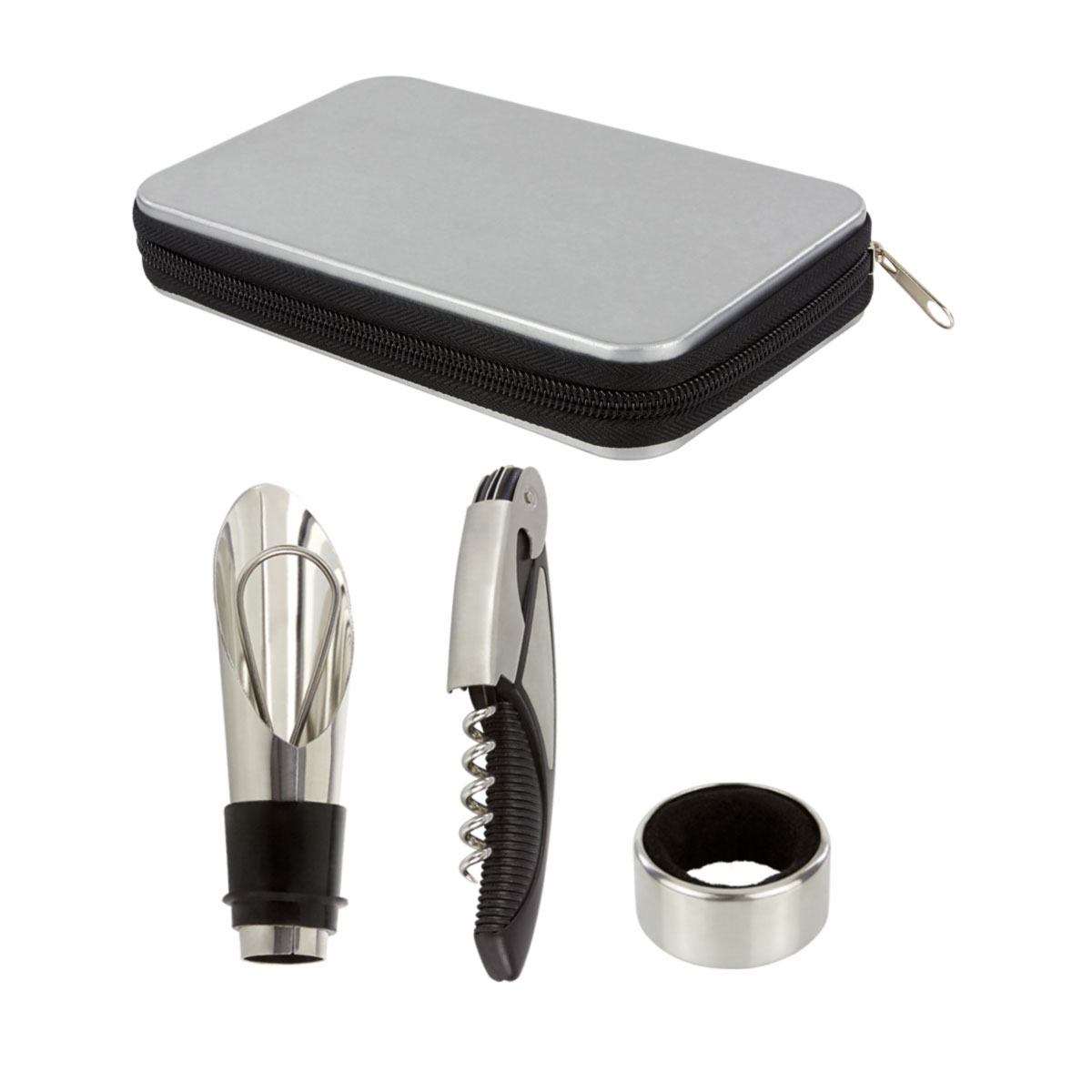 Incluye sacacorchos con navaja y destapador, arillo, boquilla, y estuche. Este producto por ser últimas piezas puede presentar alguna variación, no se aceptan devoluciones.